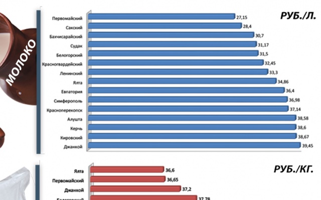 По итогам рейдов активисты выяснили, что самое дешевое молоко можно найти в Первомайском районе Крыма: средняя стоимость здесь составляет 27,15 руб. Чуть выше цена на литр молока в Сакском районе —28,4 руб., а в Бахчисарайском районе — 30,7 руб. Эти три региона поставляют своим жителям самое доступное по цене молоко.
